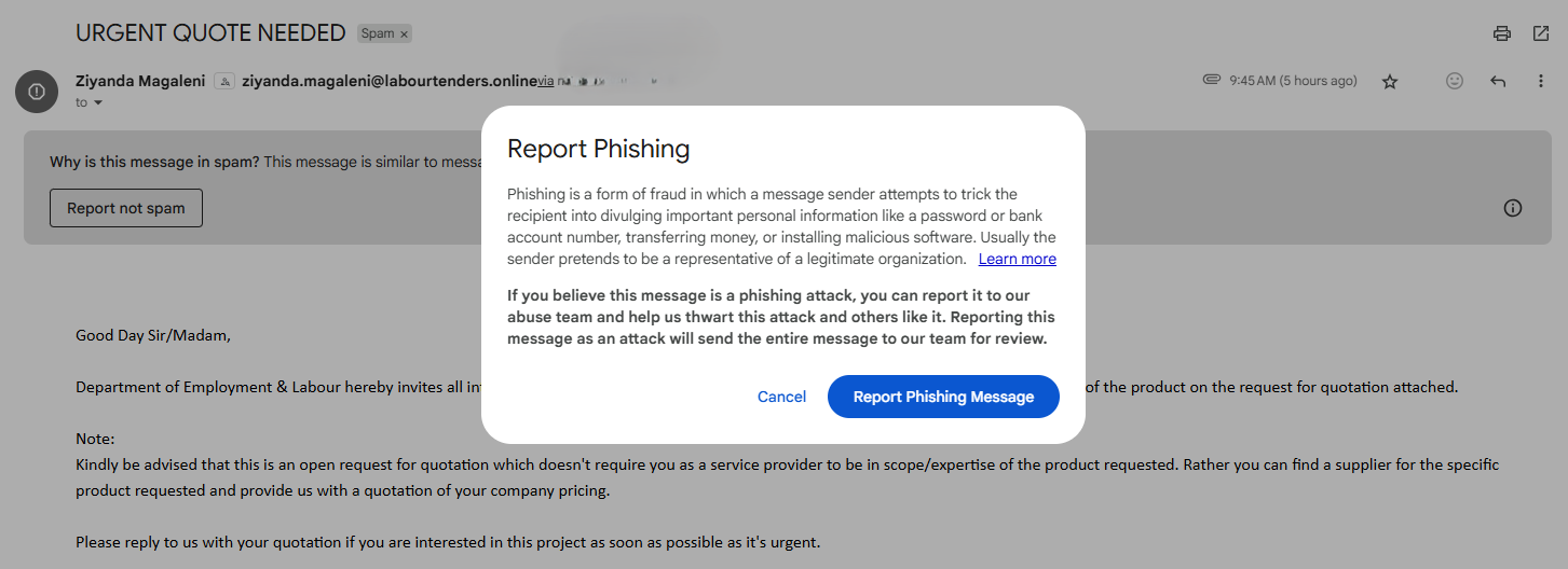 • A confirmation will appear; finalize by clicking “Report Phishing.”” This reports the account to Google, which can deactivate the email and block the hacker’s IP address.