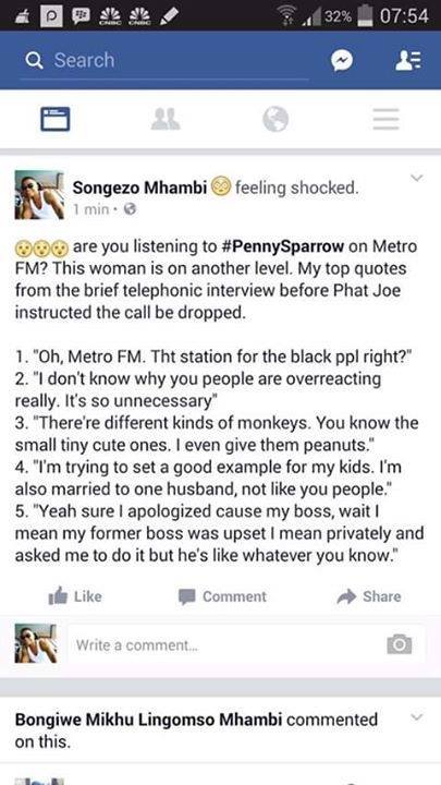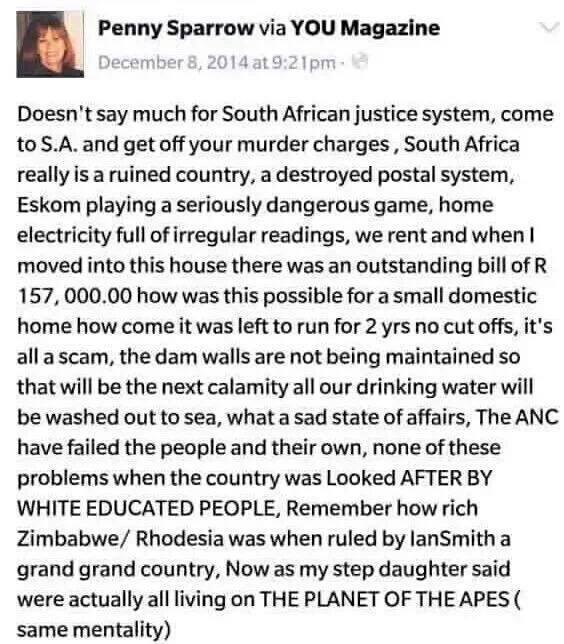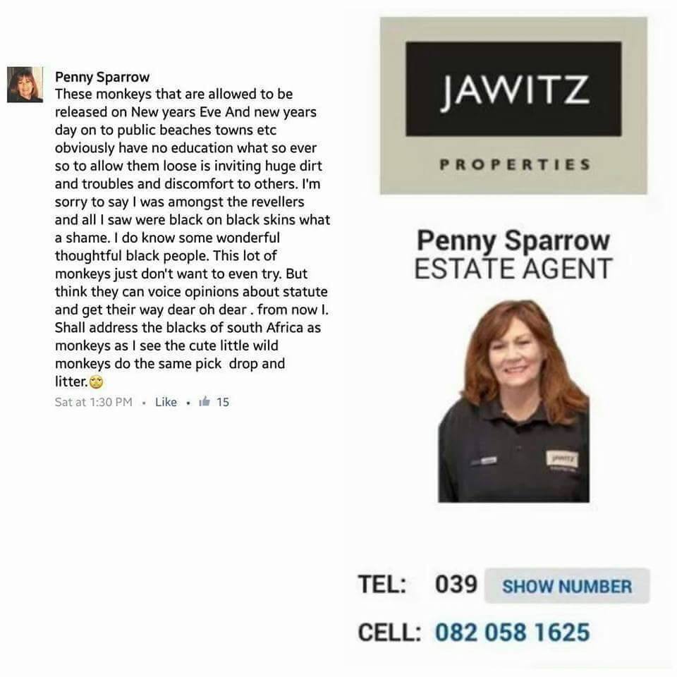 There are more discussion and comments on twitter , check#pennysparrow#jawitzproperty#blacksrmonkeys#whiteracists#hatespeech on twitter