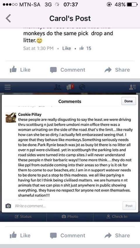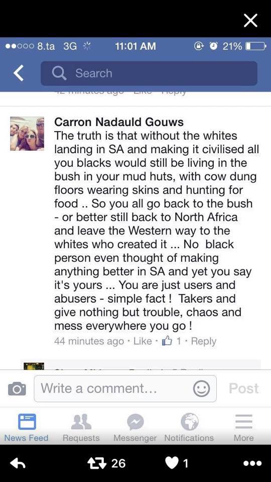 Is it possible that this hate comments are some of the real burning issues ? Just as we were planning to round our article, we received another racist comment snapshot, posted by Carron Nadauld Gouws.