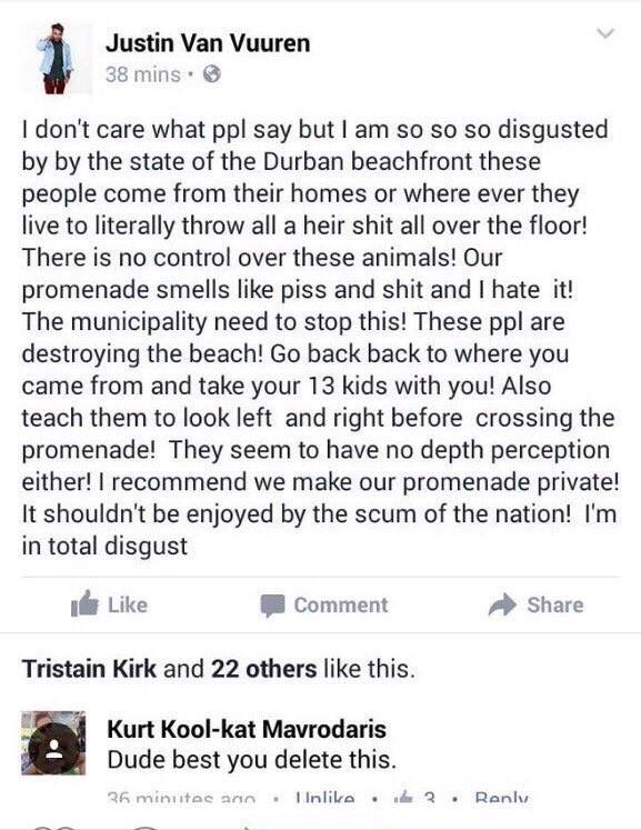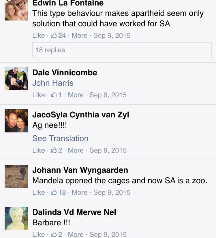 South African blacks have reacted to hate posts from Penny Sparrow, justin van Vuuren, louis Jordaan, cookie pillay, Carron Nadauld Gouws, Edwin La Fontaine, Johann van Wyngaarden, Dalinda Vd Merwe Nel, and Peter J Dreyer.