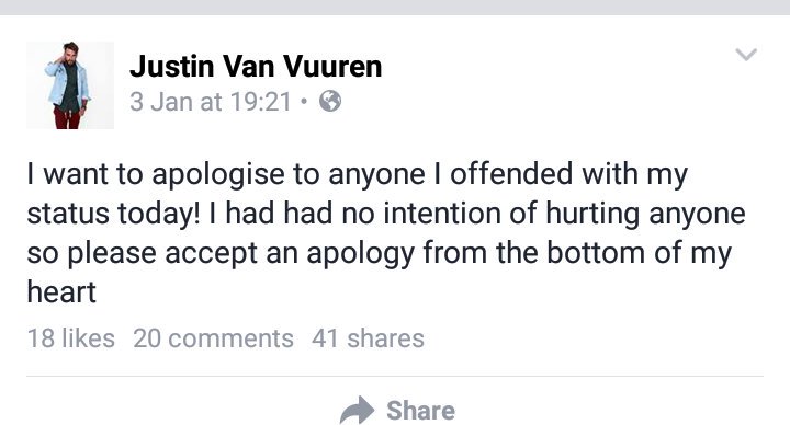 Justin offered an apology as well as Penny Sparrow, who decided to offer an apology comment after she realized the consequence of her action, and then posted an even unacceptable apology