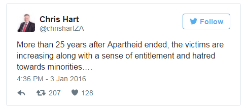 Chris Hart also engaged people on what some say was a very diabolical debate on twitter that also caught the attention of most black South Africans who also regard the move as pro-racist : check tweets under #chrishart
