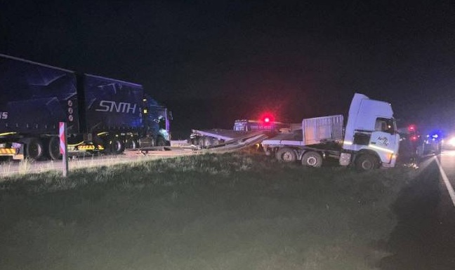 Recovery operations are ongoing, with one of the trucks already removed and efforts continuing to clear remaining wreckage.